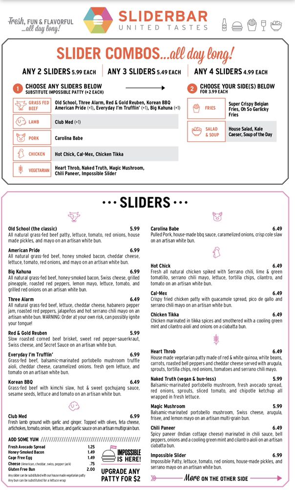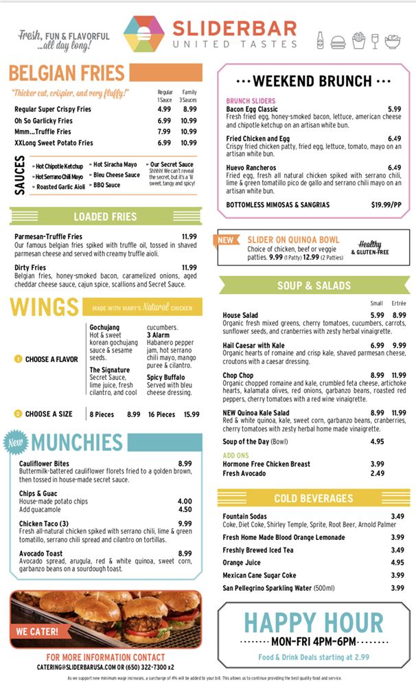 SliderBar in Palo Alto is a beer bar offering a variety of sliders, burgers, and chicken wings. With options for delivery, takeout, and reservations, SliderBar caters to all preferences. The menu includes vegan and vegetarian options, making it inclusive for all diners. Located on University Ave, SliderBar provides a casual atmosphere with outdoor seating and free Wi-Fi. Customers rave about the delicious sliders, friendly service, and extensive beer selection. Favorites include the Mediterranean Morning slider and the Finger Lickin' Chicken 'N' Waffles. SliderBar's small yet tasty sliders and delicious beer on tap are highlights, making it a popular spot for lunch or dinner. Whether you're looking for a quick bite or a place to watch the game, SliderBar offers a satisfying dining experience.